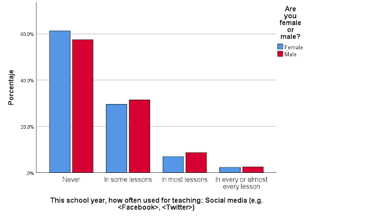 Figure 3 analyze the use of social networks from a gender perspective, we obtain results that seem to indicate that male teachers use social networks more than female teachers in education.