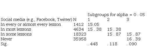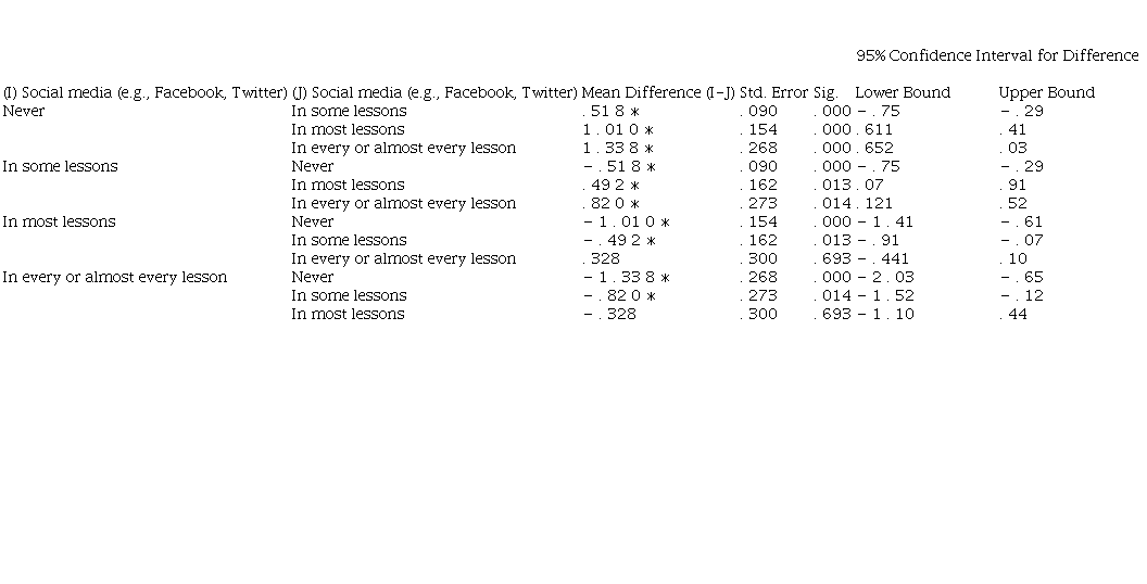 Table 9 indicates the group that “uses a lot” and “always uses” do not have different means, but the rest do. The difference in means is significant, and the more social networks are used, the fewer years the teacher has been teaching.