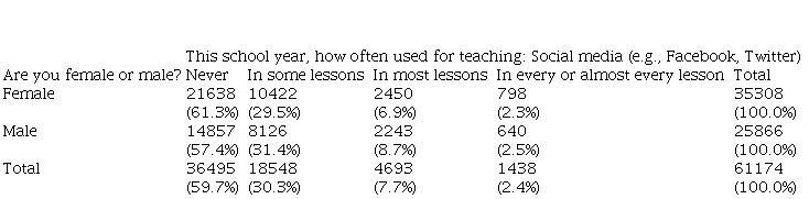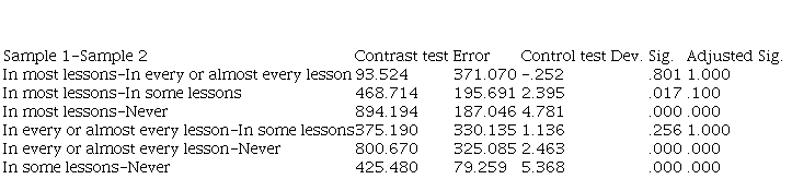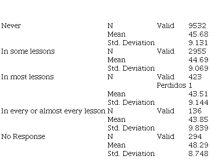 The variable TC169Q09HA was recoded for handling, and thus “Never” turned into “0”; “In some lessons” turned into “1”; “In almost every lesson” turned into “2” and “In almost every lesson” turned into “3”. This approach allowed us to establish an analysis of factorial variances, and contingency tables.