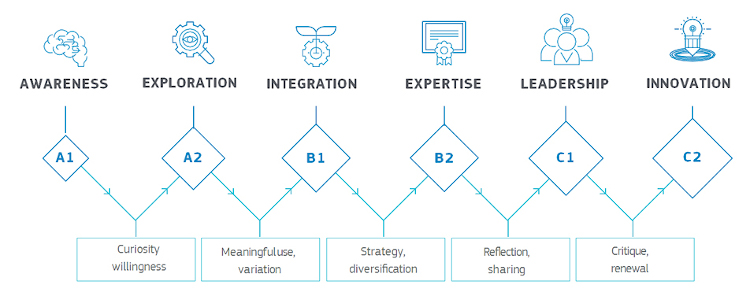 In turn, DigCompEdu proposes six levels depending on the competence qualification (Figure 2). The most basic level is called Newcomer (A1), which would correspond to teachers with very little experience and contact with educational technology, and the highest, Pioneer (C2), where teachers who lead innovation with ICT would be found.