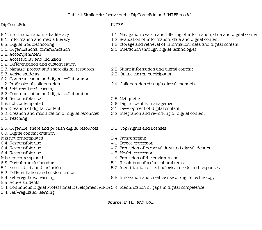 Likewise, another fundamental difference between DigCompEdu and the Spanish Teaching Digital Competence Framework is that the latter includes 21 competencies while DigCompEdu raises them to 22. However, as can be seen in the following distribution comparison (Table 1); Although with different nomenclature, most of the competences published by the INTEF have been considered in DigCompEdu.