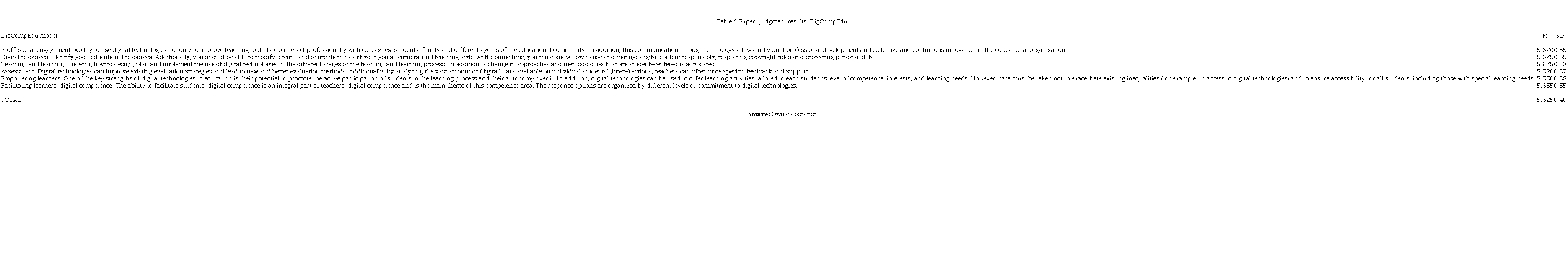 Another of the contributions of the work also allows to point out that there has been discrimination between the frames by the judges. In other words, the judges value the DigCompEdu model more significantly. Such finding will serve in the project that finances this study to approach the teacher training plan from the perspective selected by the judges, although they must also indicate to our institutions the guidelines on where to establish the training plans for teachers in DTC. In any case, it is important not to confuse the results with the fact that the INTEF model is not significant for acquiring DTC (PADILLA-HERNÁNDEZ; GÁMIZ-SÁNCHEZ; ROMERO-LÓPEZ, 2019). It is recalled that the results depend on expert judges and that the INTEF model has also been scored very positively.