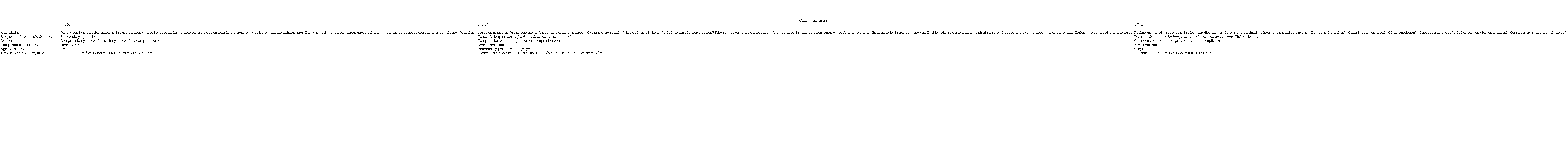En cuanto a los instrumentos utilizados para el análisis previo de contenido de los libros de texto de Lengua Castellana y Literatura, se diseñaron unas hojas de registro ad hoc, de elaboración propia, mediante las que se detallaban en profundidad las categorías preestablecidas y la emergente del análisis. A continuación se presenta una de las tablas modelo utilizada (cuadro 1) con varias actividades representativas del proyecto educativo sobre el ciberacoso, el uso de mensajes en teléfonos móviles y pantallas táctiles correspondientes a 4.º y 6.º de Primaria.