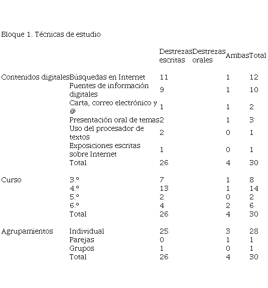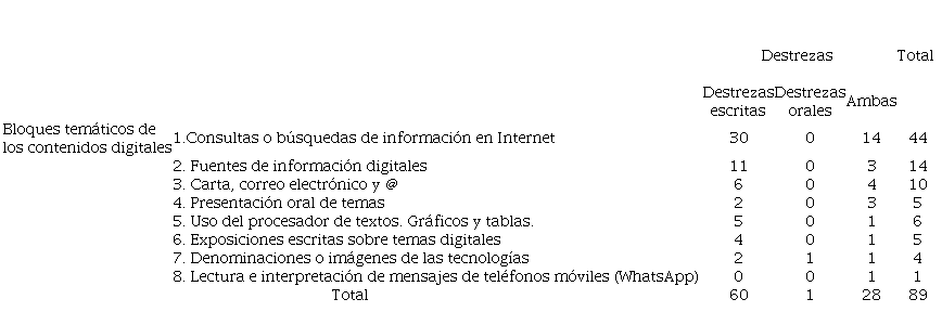 La cuadro 3 muestra que, en general, todos los bloques temáticos de contenidos digitales se han trabajado de forma escrita, ya sea a través de la adquisición de la comprensión escrita (leer) como de la expresión escrita (escribir) o de ambas, ya que solo hay 1 actividad exclusivamente oral. De entre las que fomentan las destrezas escritas (de manera independiente o ambas), aparecen 44 actividades dedicadas a la búsqueda de información en Internet; 14 a trabajar el uso de las fuentes de información digitales (periódicos, revistas, enciclopedias digitales, diccionarios, etc.); 10 a tratar la utilización de la carta, el correo electrónico y el símbolo de arroba; 5 a la presentación oral de temas concretos; 6 al uso del procesador de textos para pasar actividades y realizar tablas o gráficos y 5, a la realización de exposiciones escritas sobre temas digitales. Finalmente, hay 4 actividades referidas a la denominación e imágenes de las tecnologías, de las cuales solo 1 es oral exclusivamente3. Finalmente, la actividad dedicada a la interpretación de mensajes de teléfonos móviles trabaja destrezas escritas y orales.