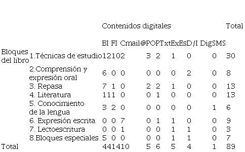 En cuanto a los bloques de contenido de los libros, ha llamado la atención que las actividades digitales se presenten, en su mayoría, en el bloque 1, dedicado a las Técnicas de estudio (33.7 %), seguido por los bloques 3 (Repasa) y 4 (Literatura) (14.6 %). Muy de cerca le sigue el bloque 6 de Expresión escrita (10.1 %), el bloque 2 de Comprensión y expresión oral (Comunicación oral) (9 %), los bloques especiales (8) (7.9 %) y el bloque 5 sobre Conocimiento de la lengua (6.7 %); obteniendo el peor resultado el bloque 7 de Lectoescritura (3.4 %); como es lógico también, ya que solo había 3 actividades pertenecientes a este bloque.