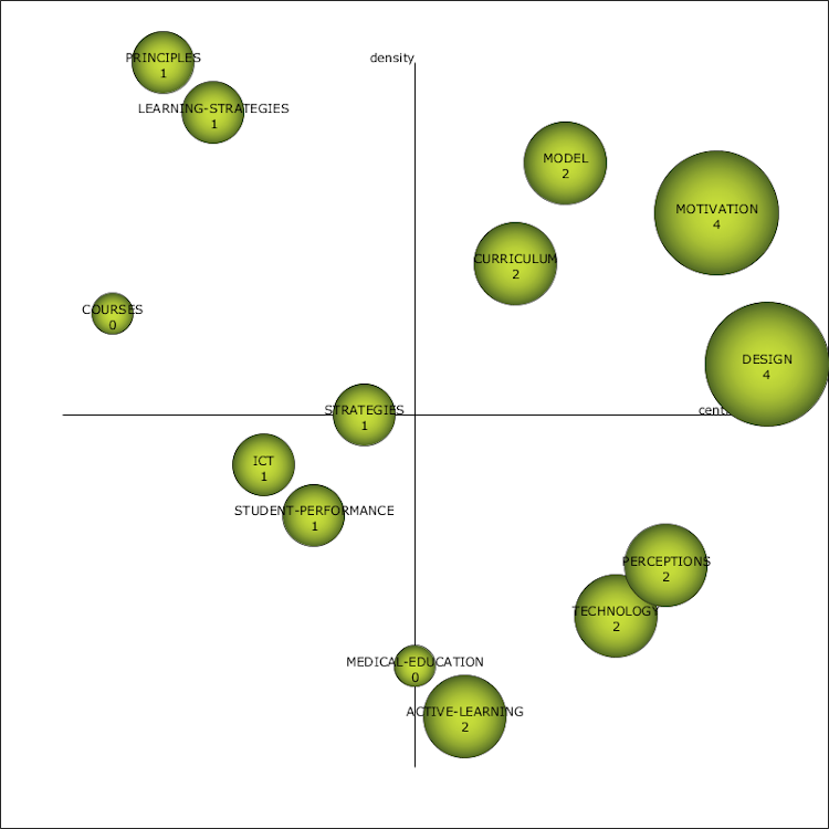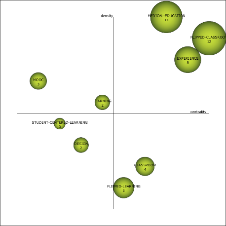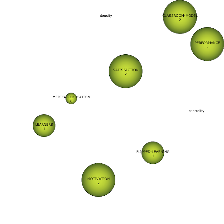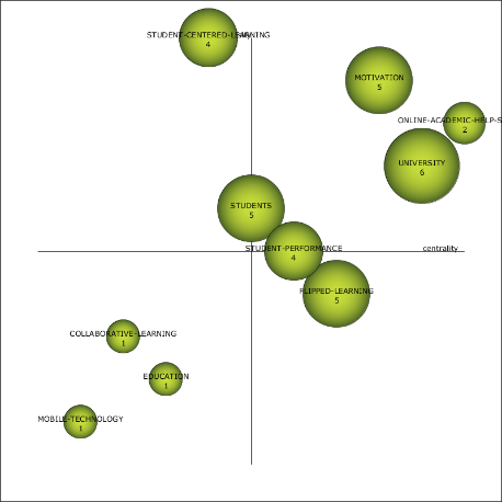Analyzing the different diagrams of the periods established in the FLCL, it can be observed that ”flipped classroom” is the theme that has been the most established in time, given that it has been a relevant theme from 2016 to 2018, continuing -in the same way- in the studies that are developed, focused mainly on ”Blended learning”, ”Higher education”, ”students” and ”active learning”. In recent years (2018-2019), there has been a growing trend in aspects related to motivation, impact on students and performance. As shown in both periods, attention should be paid to the topics ”ICT”, ”strategies”, ”student performance” and ”medical education”, as they are concepts whose durability implies a mystery, and may disappear in the future or emerge as driving themes (figuras 3a a 3g).