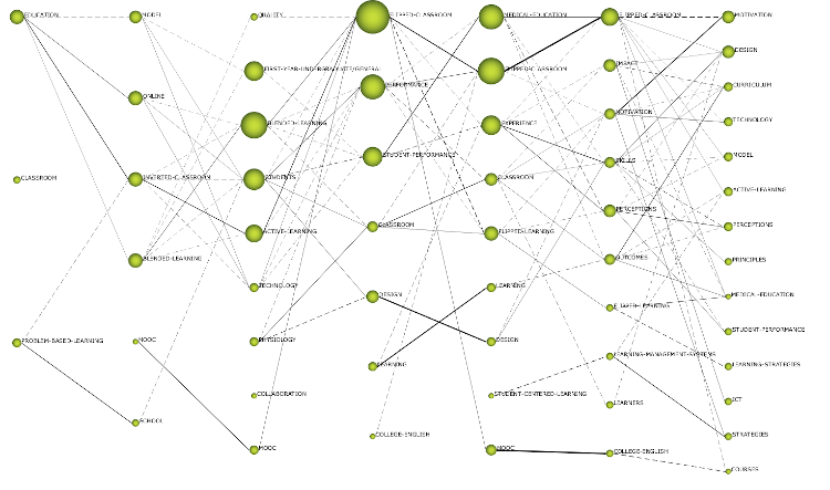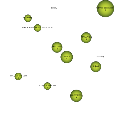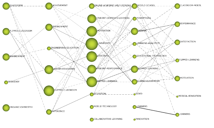 FLLE shows an analogous circumstance, with conceptual gaps between the established periods, with the ”flipped learning” theme marking a constant and conceptual trend from the 2017 period to the present. The established connections, both conceptual and non-conceptual, present a low relationship strength. Nevertheless, there are many connections between diverse themes, which mark the constant and variable tendency in the experts of this field of knowledge.