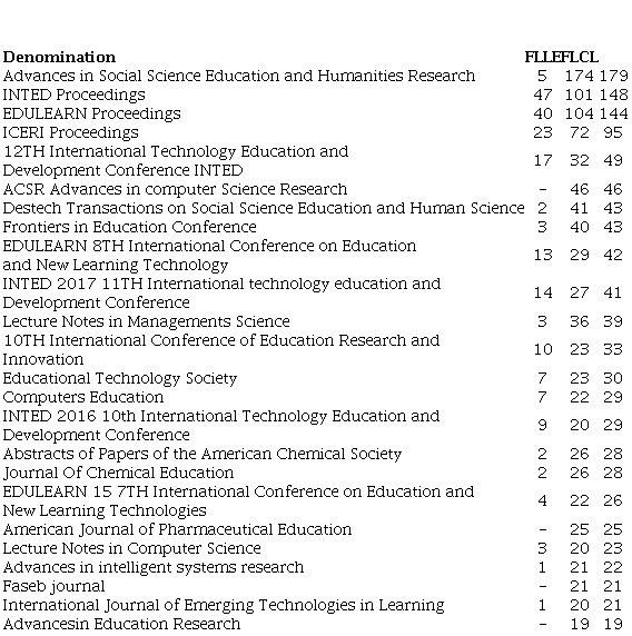 Regarding the source of publication (cuadro 9), the collection ”Advances in Social Science Education and Humanities Research”, is the one that most publishes on FLCL, while on the FLLE concept is the collection ”INTED Proceedings”.