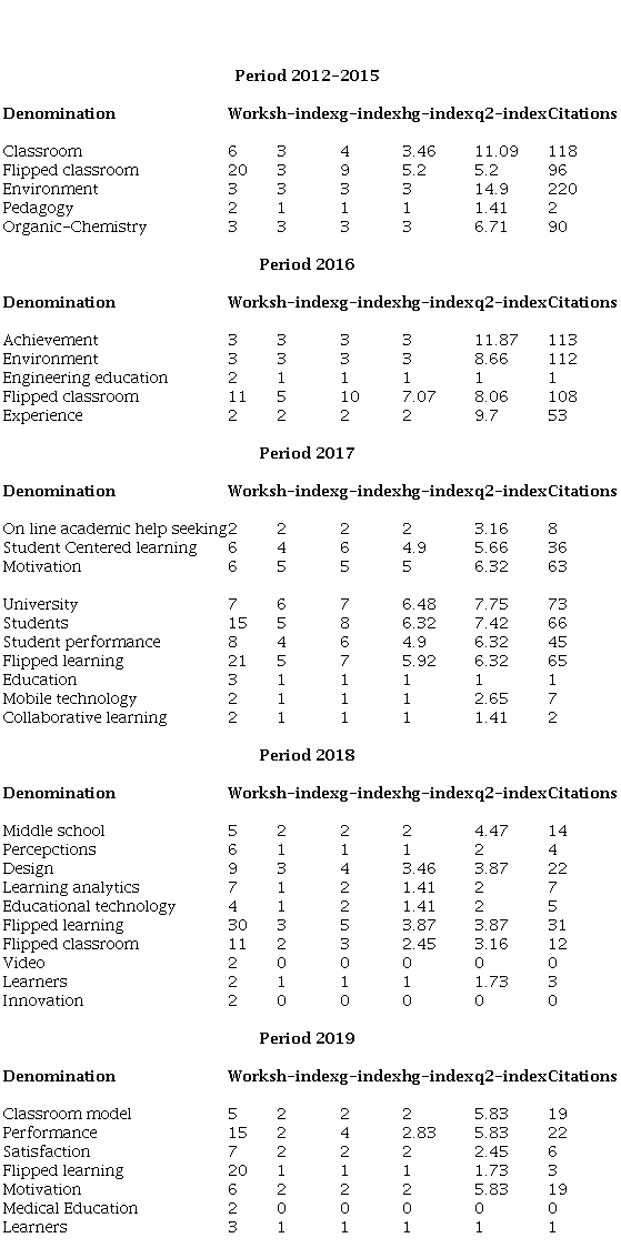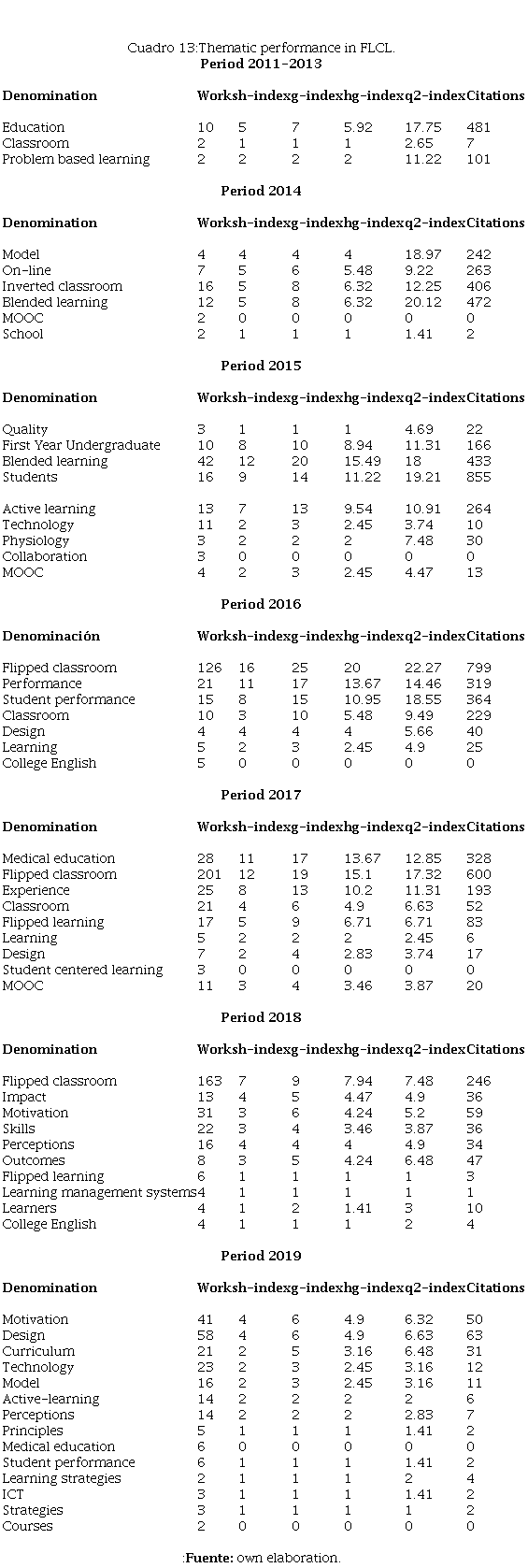 Fuente: own elaboration.As shown in Cuadro 13, in relation to FLCL, there is a thematic plurality in the different established periods, given the variety in the research reported in this field of knowledge, but with a continuous line between periods, if we bear in mind the different bibliometric indicators. Specifically, in 2014 and 2015 the concept with the most indices was ”blended learning”, while from 2016 to 2018 the ”flipped classroom” theme is included in the witness. It is in 2019 that a radical change in research perspectives is shown, with new topics and new lines of study being offered.