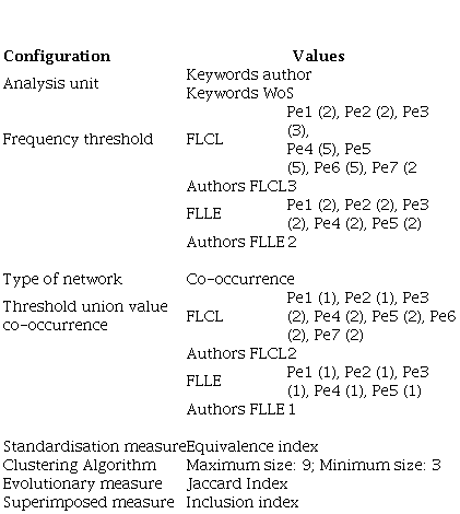 Determination of thematic focuses: Taken in the analysis of the evolution of the nodes in several time intervals. The strength of the association between the themes occurs in the volume of common keywords. The following periods (Pe) were established for FLCL: 2011-2013 (Pe1); 2014 (Pe2); 2015 (Pe3); 2016 (Pe4); 2017 (Pe5); 2018 (Pe6) and 2019 (Pe7), and the following for FLLE: 2012-2015 (Pe1); 2016 (Pe2); 2017 (Pe3); 2018 (Pe4); 2019 (Pe5). The periods have been configured in such a way as to bring together a minimum of 100 references in each of them.
