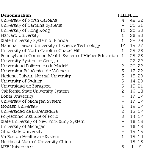 The reference institution for the FLCL is the University of North Carolina, while for FLLE it is the National Taiwan University of Science Technology. The rest of the institutions have a medium or low incidence in scientific production (cuadro 7).