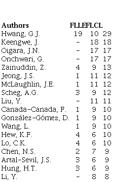The main author in FLLE is Hwang, G.J., while in FLCL there are several authors with a high output, such as Keengwe, J., Oigara, J.N. and Onchwari, G (cuadro 8). It also reflects the presence of authors who develop works using both terms.