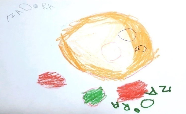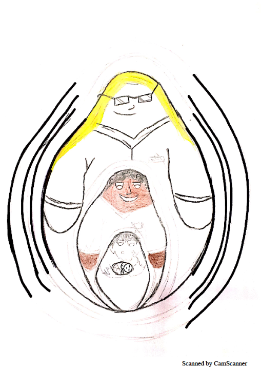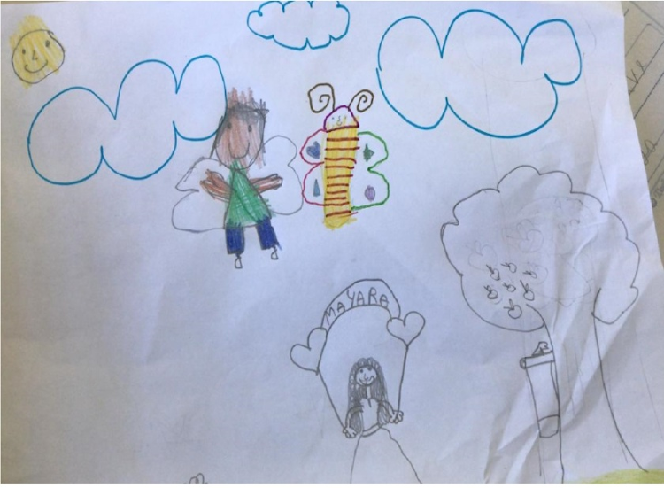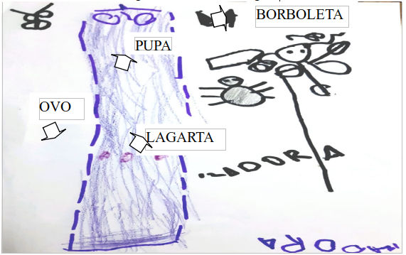 Na delicadeza expressa pelos traços que contornam a metamorfose, podemos perceber as trans(formações) do ciclo da vida, sempre acompanhadas pelo olho, que é do reino animal. Chamamos a atenção para os olhos que estão (são) em todas as dimensões, representadas no desenho feito pela Isadora e em sua interpretação das lentes. O foco da lente não pode ser fragmentado em partes, é necessário olhar e contemplar os quatro estágios da borboleta, metamorfosear a auto(trans)forma(ação) em sua totalidade, pelas nuances dos vários olhos da borboleta, e que também é acompanhado pelo olhar da criança. Isadora desenhou a borboleta pela representação de uma pessoa com as asas e os olhos. Interessante perceber as similaridades para além dos olhos. As borboletas, assim como os humanos precisam desta engrenagem: pessoa, processo, tempo e contexto e isso vem ao encontro de outra imagem construída pela Mayara (Figura 4):