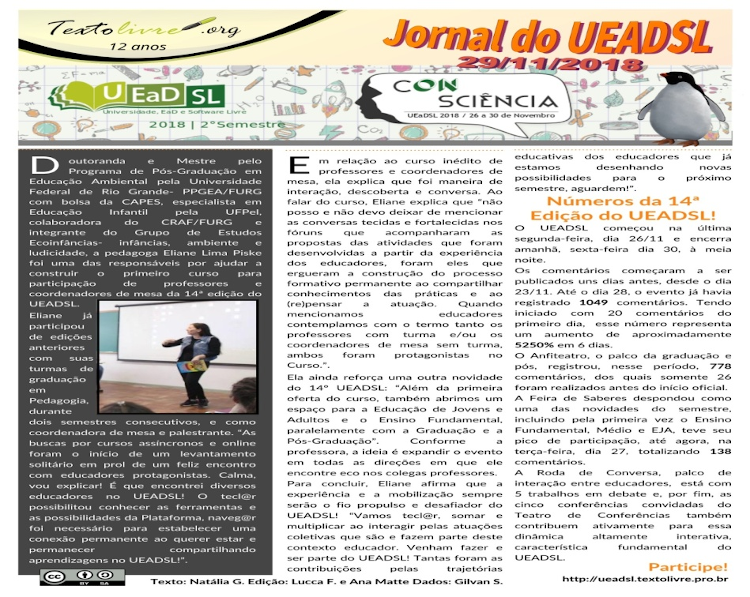 Com a participação nos espaços formativos, evidenciamos que não podemos olhar para os fenômenos em um único contexto. Diferentes lentes são necessárias para amplificar os olhares. Isso é que justificou compartilhar conhecimentos tanto na modalidade a distância como presencial. Os encontros foram uma oportunidade para observar que as pessoas podem estar vivendo situações adversas, mas tendo uma ótica mais otimista a partir de suas emoções, sentimentos e crenças. Isso advém da possibilidade de conversar com os educadores antes da ação que está a ser construída e fortalecida pelas experiências. Aproveitamos o ensejo para evidenciar a participação no Congresso Universidade EAD e Software Livre (UEADSL), um evento acadêmico semestral, online e gratuito promovido pelo Grupo de Pesquisa Texto Livre (ANDRADE et al., 2019). O Texto Livre é um contexto educador multidisciplinar que integra vários eventos. No ano de 2018 desenhamos o primeiro Curso para participação de professores e coordenadores de mesa no 14ª. Congresso UEADSL (MATTE; PISKE, 2020), além da primeira oferta do curso que foi aberto com um espaço para a educação básica na Feira de Saberes, paralelamente com a Graduação e a Pós-Graduação. Conforme podemos observar o Jornal do UEADSL, evidencia a contribuição do curso na formação docente: