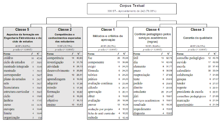 Os achados desta classe podem ser considerados confirmatórios dos drivers selecionados na Classe 2. Funcionam como uma especialização da Classe 2. Por exemplo, “plano de estudos”, “licenciatura” e “mestrado” são uma especialização de “ciclo de estudos” que foi classificada como driver nesta Classe. Também ficou legitimado que o “ciclo de estudos” é “realizado” pela oferta de um conjunto de “unidades curriculares”.