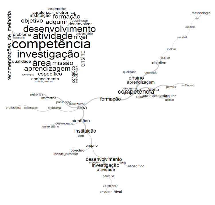 Neste cerne, o termo “competência” é uma raiz central que se associou mais fortemente com as outras raízes de menor força de coocorrência, mas não menos importantes, como: “ensino-aprendizagem”, “área” + “profissional” e “desempenho” + “científico” + “tecnologia”. Embora estes termos sejam elementos centrais da representação, as suas ramificações permitem-nos inferir a estreita ligação destes para o alcance do resultado final esperado dos estudantes: as competências do engenheiro. Isto pode ser destacado nos excertos: