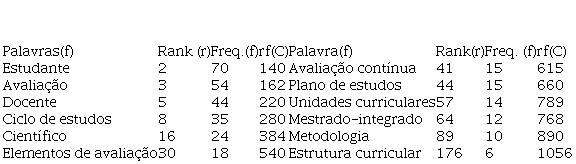 Ainda na Tabela 3 é evidenciado um extrato com alguns vocábulos que se destacaram durante a análise por apresentarem elevada frequência ou rank significativos de ocorrência no corpus textual. A Tabela 3 está ordenada por (C) em ordem crescente. Nota-se, por exemplo, que os termos “estrutura curricular” e “metodologia” se destacaram na amostra, impulsionados pelo alto rank (r) associados à frequência de repetição (f), sendo termos que podem obter importante destaque para a riqueza lexical do vocabulário. Nesta lógica, os termos “plano de estudos”, “avaliação contínua” e “elementos de avaliação” também podem ser potenciais destaques para a análise da adoção de metodologias não tradicionais no curso avaliado.