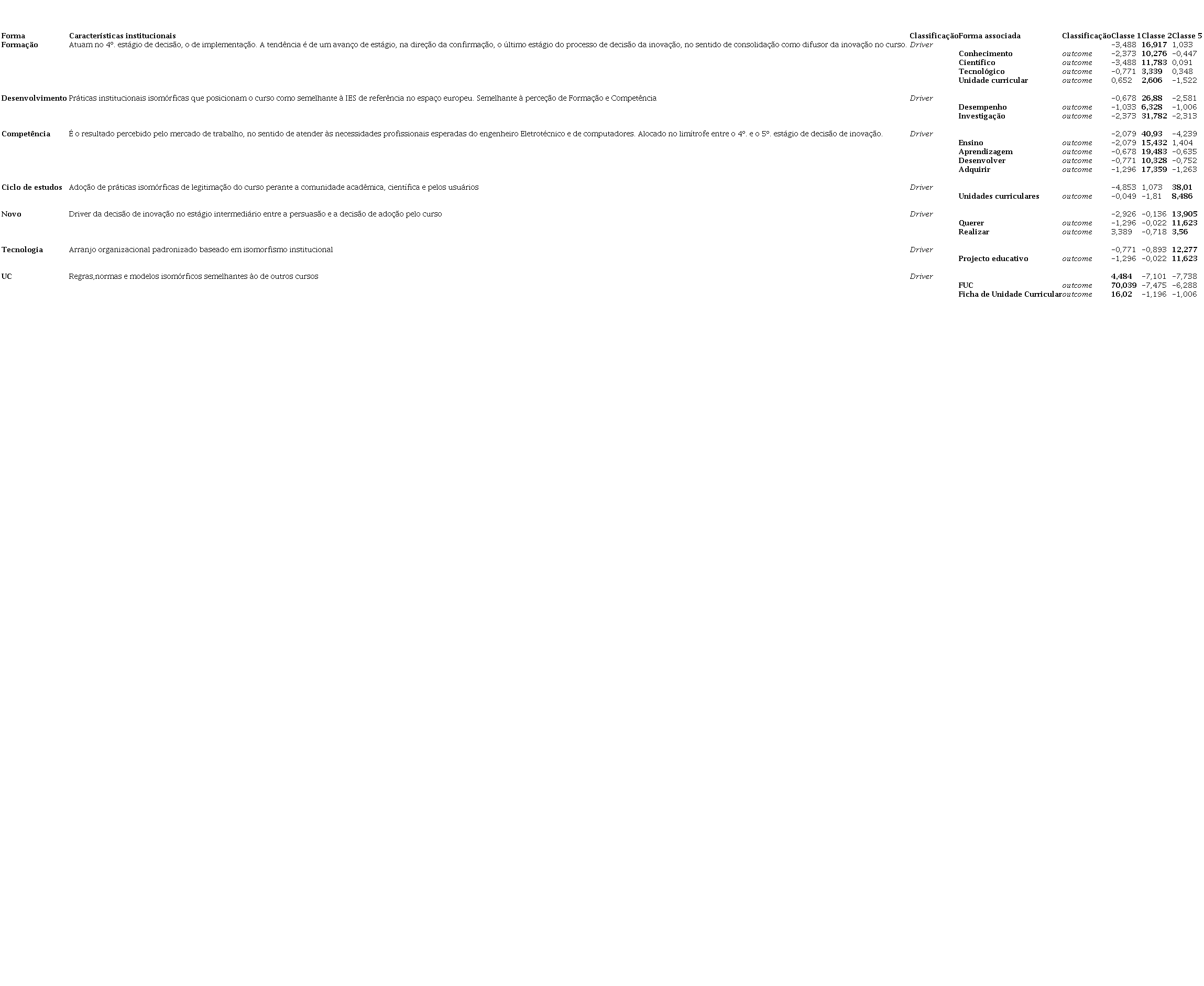 A Tabela 4 apresenta a síntese dos drivers e outcomes com as suas respectivas classificações por classe. Os três primeiros drivers “Formação”, “Desenvolvimento” e “Competência” foram representativos da Classe 2. Mostraram-se associados à transição entre o quarto e o quinto estágio do processo de decisão da inovação, entre a implementação e a confirmação da sua decisão de inovação.