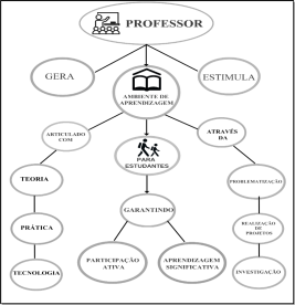 O Fluxograma da fig. 1 retrata a proposta emergente de aprendizagem e ressalta que, para romper os desafios tecnológicos que provocaram inovações educacionais, o educador contemporâneo deve criar e promover um ambiente de aprendizagem para todos os estudantes, articulado com a teoria, com a prática e com a tecnologia proporcionando uma participação ativa e uma aprendizagem significativa do alunado por meio de problematizações, investigação e realização de projetos.