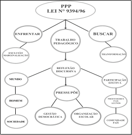 Na fig. 2 podemos observar que o próprio PPP (Projeto Político Pedagógico), que é alicerçado em um trabalho pedagógico amparado pela Lei 9394/96, Art. 12, 13, 14 e incisos, pressupõe uma concepção de mundo, homem, sociedade e escola e exige a efetiva participação dos alunos, dos pais, dos professores, da comunidade e do governo municipal, estadual e federal.