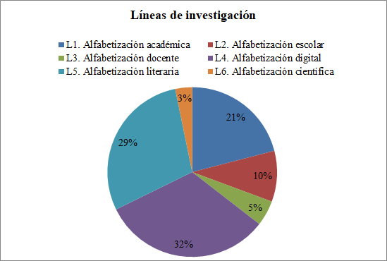 Considerando las 62 líneas sobre alfabetizaciones identificadas en el DGPB/CNPq, se derivan los porcentajes siguientes: L1, 21%; L2, 10%; L3, 5%; L4, 32%; L5, 29%; y L6, 3%. Estas cifras ilustradas en el Figura 1, sugieren que L4 y L5 son predominantes, con 32% y 29%, respectivamente. En el caso de L4, tal magnitud se explica por el hecho de que el empleo de las TDICs en la vida cotidiana y en los entornos educativos actuales es muy común. Evidentemente, el uso de las tecnologías digitales que soportan los diferentes medios de comunicación (escritos y orales) en las prácticas sociales genera demandas, especialmente de enseñanza, todo lo cual está directamente vinculado a la alfabetización digital.