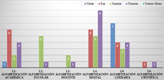 Debe hacerse notar también que, si bien L3 es fundamental para el desarrollo de la educación, solo tiene el 5% de los registros en el DGPB/CNPq. A continuación, presentamos el Figura 2 donde se muestra la distribución de las líneas investigativas sobre alfabetizaciones en las diferentes regiones brasileñas.