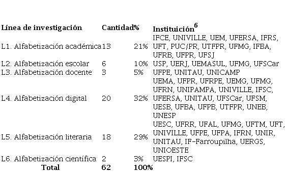 Los datos muestran los siguientes números de líneas de investigación sobre alfabetizaciones registradas en el DGPB/CNPq: 13 en L1. Alfabetización académica; 06 en L2. Alfabetización escolar; 03 en L3. Alfabetización docente; 20 en L4. Alfabetización digital; 18 en L5. Alfabetización literaria; y 02 en L6. Alfabetización científica. En total, se identificaron 62 líneas, procedentes de 43 instituciones de enseñanza e investigación brasileñas.