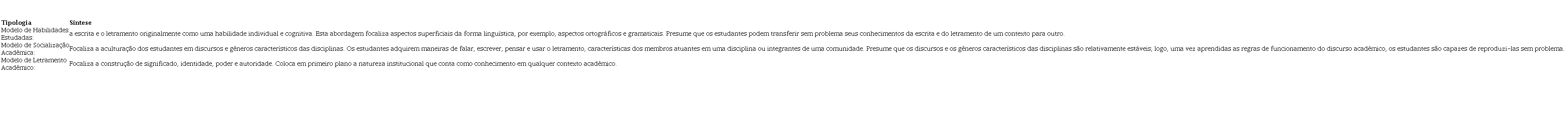 Na medida em que o primeiro modelo, de habilidades estudadas, entende a escrita como habilidade exclusivamente cognitiva, a ser aprendida nos primeiros anos de contato com a escola e que desconsidera a relevância dos contextos, como a universidade, ele não nos interessa. O segundo modelo, de Socialização Acadêmica, por sua vez, tem um viés instrumental e não abrange os objetivos de formação de cidadãos críticos, pois não é voltado para uma leitura significativa do mundo, mesmo que os sujeitos atuem com eficiência nos seus contextos de interação. Já o Modelo de Letramento Acadêmico dialoga diretamente com o entendimento de língua que este trabalho assume, focado na importância dos processos de construção de sentidos para uma leitura mais ampla dos eventos entendidos em seus contextos e em diálogo com saberes mais amplos de mundo. Consequentemente, a esse modelo importa o contexto acadêmico.
