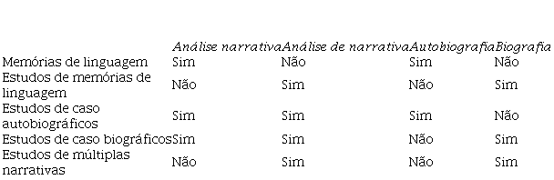A diferença entre análise narrativa e análise de narrativa é que a primeira não analisa, necessariamente, narrativas, mas vem em forma de narrativas, a exemplo de qualquer relato. O único tipo de pesquisa narrativa do quadro que não apresenta análises é as memórias de linguagem escritas, normalmente, para fins pessoais e sem nenhuma conexão com o pesquisador ou a academia. Trabalho aqui com um estudo de múltiplas narrativas em relação às tecnologias que se enquadram no modelo Histórias de Aprendizagem de Línguas, apesar de os contextos de usos das referências citadas sejam o ensino de segunda língua ou língua adicional, e não na formação de professores de língua materna. Para Barkhuizen, Benson e Chik (2014, p. 37),