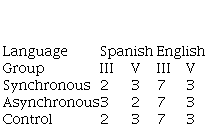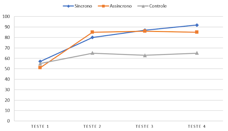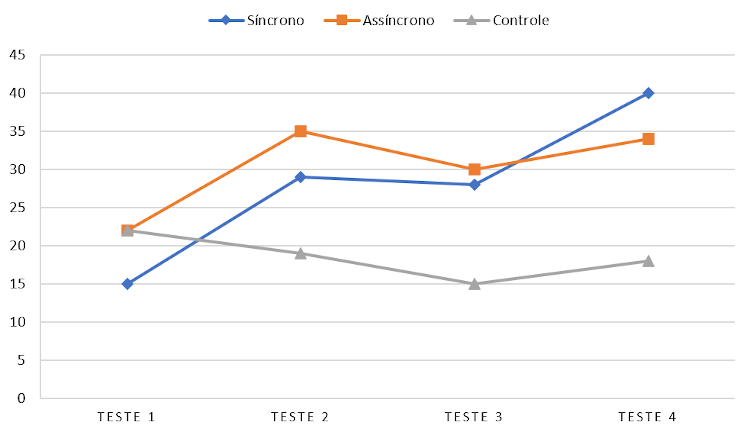 When analysing the learning progress in Spanish, the Friedman test (FRIEDMAN,1940) showed that results differed between the 4 tests [X2(3) = 10,390; p = 0.016], especially in questions 1[X2(3) = 10.909; p = 0.012], 2 [X2(3) = 18.600; p < 0.001], 3 [X2(3) = 16.615; p= 0.001], and 5 [X2(3) = 12.353; p= 0.006]. The multiple comparison tests showed that the biggest difference was between tests 1 and 4. The experimental groups, unlike the control group, showed improvement in results, especially the synchronous group.