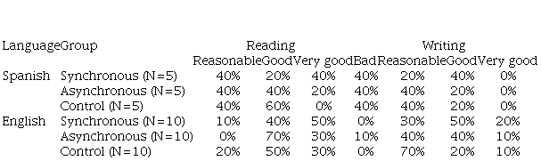 In self-assessment questions, 40% of Spanish students considered their reading in the foreign language ”reasonable” and their writing ”bad”; these options were selected by only 10% and 3% of English students, respectively. The classification of writing as ”very good” was not used by any Spanish student but by 13% of English students. The distribution of the answers is organised in Table 2.