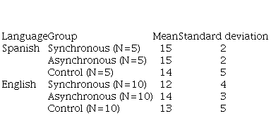 English students demonstrated a greater prior knowledge of anaphora than Spanish students (Q2), probably because they have been studying it for longer than the others; and they also presented the best results on the tests, reaching the final score above 80% on the reading test. Although the experimental groups showed improvement in the reading tests, the same did not happen with writing (Q3). A better progress in learning was identified in the synchronous groups (Q1), which achieved the highest scores on the final test (80% and 92%), but the difference with the asynchronous groups was not significant ( p < 0 . 05 ).