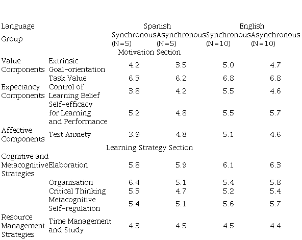 No significant differences were found between the groups. In general, responses were similar and positive. The main results were students’ high interest in language learning (Task Value) and confidence that they can learn the subject (Self-efficacy for Learning and Performance). In addition, they present good learning strategies such as linking contents (Elaboration), organisation (Organisation), and self-regulation for study (Metacognitive Self-regulation).