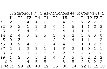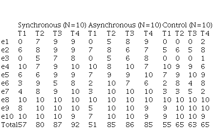 In the next section, results are presented and discussed. Only data from those who participated in all tasks are used for analysis. In the synchronous group, students have been monitored by the attendance list, class records, and materials used. In the asynchronous group, learners have been monitored by access to Moodle and their participation in forums and exercises. The distance learning platform is provided by the university and records students’ access to the course.