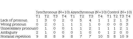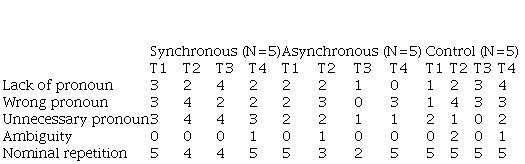 Each lesson in this study (intervention with the experimental groups) included the following moments: activation of prior knowledge on the topic; lecture on anaphora for half an hour; reading and analysis of material; group discussion; reading and writing exercises; and feedback. Some practical differences between synchronous and asynchronous modalities were: the lecture, which was either live or recorded; the discussions, which took place orally live or in written forums; and the feedback, which was done after all the students in the class had finished each activity or automatically on the computer after each exercise. While synchronous learning allows for a greater contact between peers and with the teacher, asynchronous learning allows for automatic feedback and access to a greater amount of information, in addition, of course, to flexibility of time.