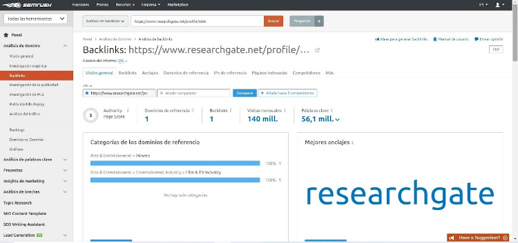 SEMRUSH… (2021) permite realizar tres tipos de análisis desde la barra principal: de dominio web, por palabra clave, o URL determinada ―como será el caso―, para estudiar la evolución del dominio; detectar anomalías; obtener una visión general de qué factores se deben mejorar u optimizar para incrementar el tráfico sobre el perfil analizado; conocer cuáles son las mejores palabras clave para un sector profesional dado; y/o hacer una analítica de enlaces, o backlink, encaminada a lograr que un sitio web sea enlazado por terceros.