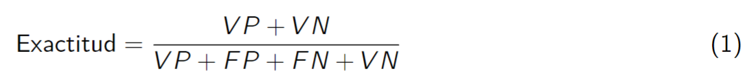 Donde, TP son los resultados Verdaderos Positivos (True Positive), TN son los resultados Verdaderos Negativos (True Negative), FP son los resultados Falsos Positivos (False Positive) y FN son los resultados Falsos Negativos (False Negative).
