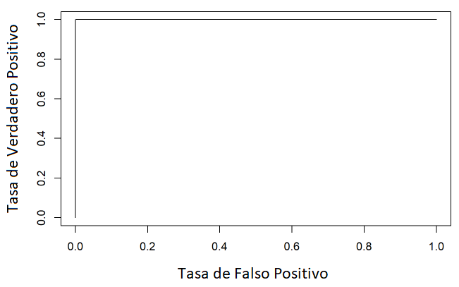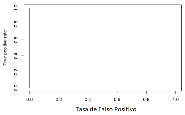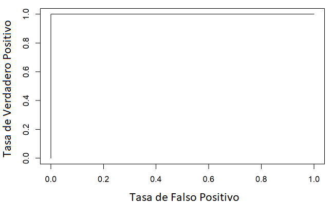 De la Tabla 5 podemos concluir que 0 de 23 predicciones fueron erróneas, mientras que 23 de 23 predicciones acertaron. La Figura 10, muestra la curva ROC del modelo, y se observa que la curva es una constante 1 en el eje horizontal, lo que implica un 100% de predicciones realizadas correctamente.