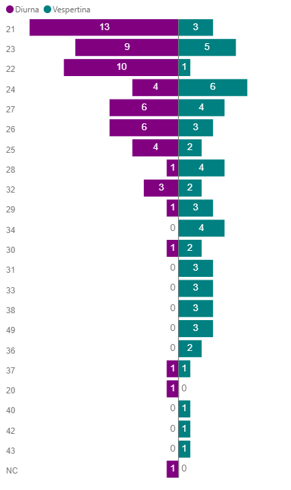 De los datos recopilados se puede observar que la cantidad de test realizados en modalidad diurna y vespertina es similar, alcanzando para diurno 52% (61 test) de las muestras y para vespertino el 48% (57 test) de las muestras. La distribución del recuento de edades se puede observar en la Figura 1, donde la agrupación de test se encuentra entre los 21 y 25 años.
