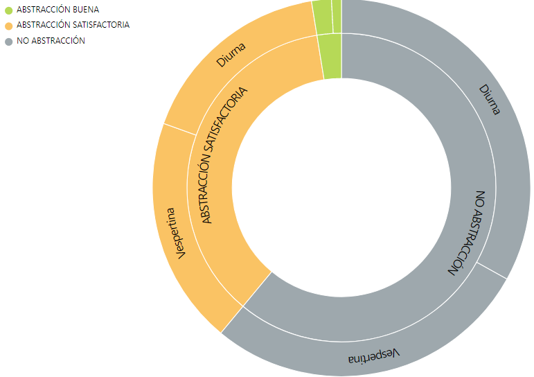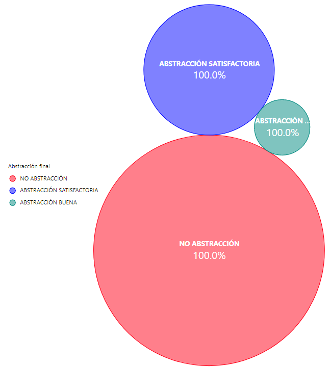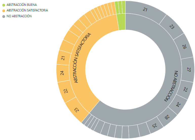 Del total de test realizados ninguno de los evaluados obtuvo Abstracción Óptima. La Figura 2 muestra como el resultado No Abstracción predomina con un 61,1%, sobre las otras evaluaciones, la sigue la Abstracción Satisfactoria con un 36,4% y finalmente la Abstracción Buena con un 2,5%. Esto quiere decir que el 97,4% tienen un nivel de abstracción medio, lo que es muy preocupante, en especial el 61,1% que no logró la habilidad cognitiva superior de abstraer.