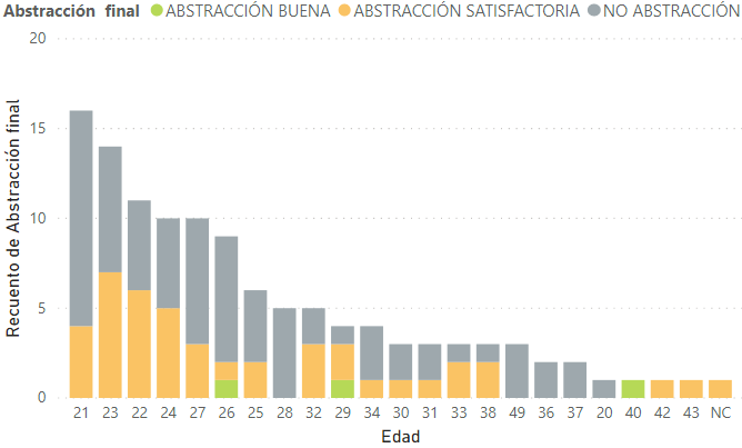De este análisis se puede observar en la Figura 3 que la relación de abstracción/modalidad sigue un patrón del 50% para todas las categorías de abstracción. Por otro lado, en la Figura 4 y Figura 5, se puede observar la relación abstracción/edad muestra que las categorías Abstracción Satisfactoria y No Abstracción se distribuyen homogéneamente en todas las edades y la Abstracción Buena no sigue una distribución homogénea, mostrando esta categoría para edades de 26, 29 y 40.