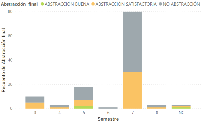 Esto es una solución factible si se piensa en estudiantes de primer o segundo semestre, donde un remedial puede ser una solución para semestres venideros. Sin embargo, como muestra la Figura 6, el problema de la abstracción se acumula en el semestre 7, cuando el estudiante está a un semestre de terminar su carrera, y por lo tanto ya no es eficiente y efectivo activar una acción de mejora.