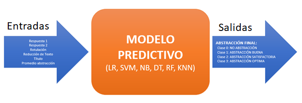 La base de datos se divide en 8 variables de entrada, que se obtienen del test de abstracción realizado a los estudiantes, y 1 variable de salida que es la evaluación final del test de abstracción, la cual puede tener como resultado: No abstracción, Abstracción buena, Abstracción satisfactoria y Abstracción óptima, cuatro clases. La Figura 7 muestra el modelo de predicción utilizado.