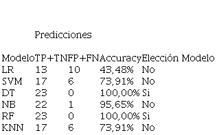 Los resultados obtenidos con el modelo de NB se pueden observar en la Tabla 6, que describe la matriz de confusión de las predicciones del modelo comparados con el set de pruebas.
