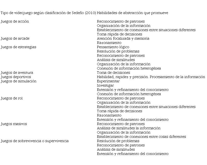 Los videojuegos, al igual que las películas o la música, están clasificados teniendo en cuenta la edad de los usuarios. En este sentido, Sedeno (2010) clasifica el juego en distintas tipologías. Teniendo en cuenta esta clasificación, se ha relacionado cada uno de los tipos de juego con las habilidades de abstracción que promueve Tabla 1 a partir de Marzano y Pickering (2005).
