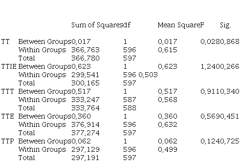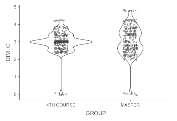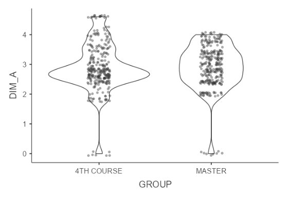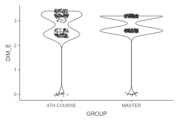 The ANOVA of the different dimensions with the variable ”degree/master’s degree” was carried out by calculating Fisher’s F (Table 4), which shows that the relationship from highest to lowest is between the following: