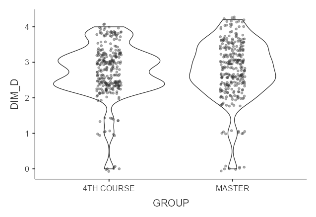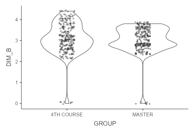 Table 4 shows two very interesting values in this research, on the one hand, the strength of the relationship between the dimension and the sample groups (the highest strength corresponds to dimension B and the lowest to dimension A) and, on the other hand, the level of significance to reject the null hypothesis of equality (p<.005), in this case, we accept the equality of the means, so there are no differences in responses to the items between the two groups.