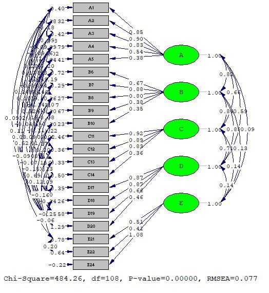 The relationship between the latent variables is given by: A-B (.82), A-C (.66), A-D (.59), A-E (.09), B-C (.84), B-D (.85), B-E (.13), C-D (.71), C-E (.14) and D-E (.14).