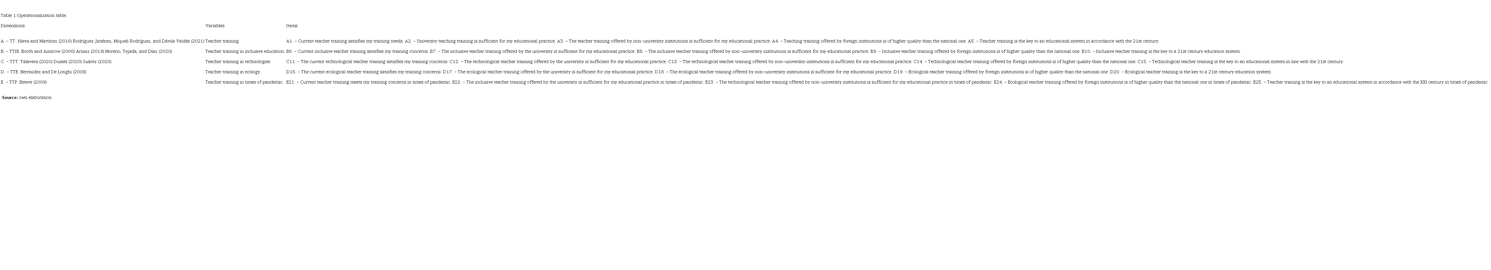 Table 1 shows how the Likert scale was constructed, using the theoretical framework, dimensions and variables as a guide.