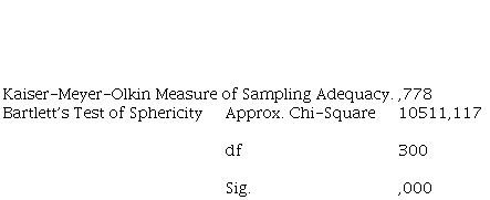 Preliminary analysis: the Kaiser-Meyer-Olkin measure of sampling adequacy (KMO coefficient) has been used, in our case the value is .778, following Kaiser (1974) the value is acceptable, the result of Bartlett’s test of sphericity is .000 and the Determinant 1.299E-8, so we continue with the analysis.